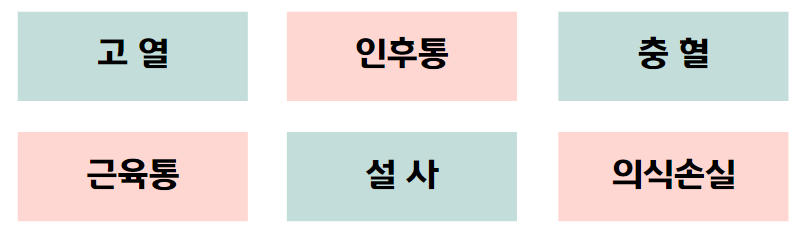 발열, 인후통, 식욕 부진, 메스꺼움, 구토, 설사, 나른함, 저혈압 등과 함께 근육통 등으로 초기에는 명백한 증상이 없는 경우도 있습니다.